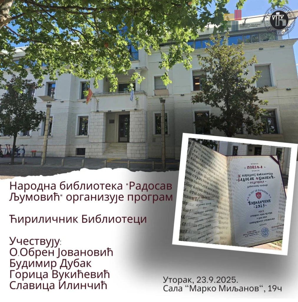 Obavještvamo Vas da će Narodna biblioteka “Radosav Ljumović” u utorak, 23. septembra, s početkom u 19 časova, organizovati program pod nazivom Ćiriličnik Biblioteci.