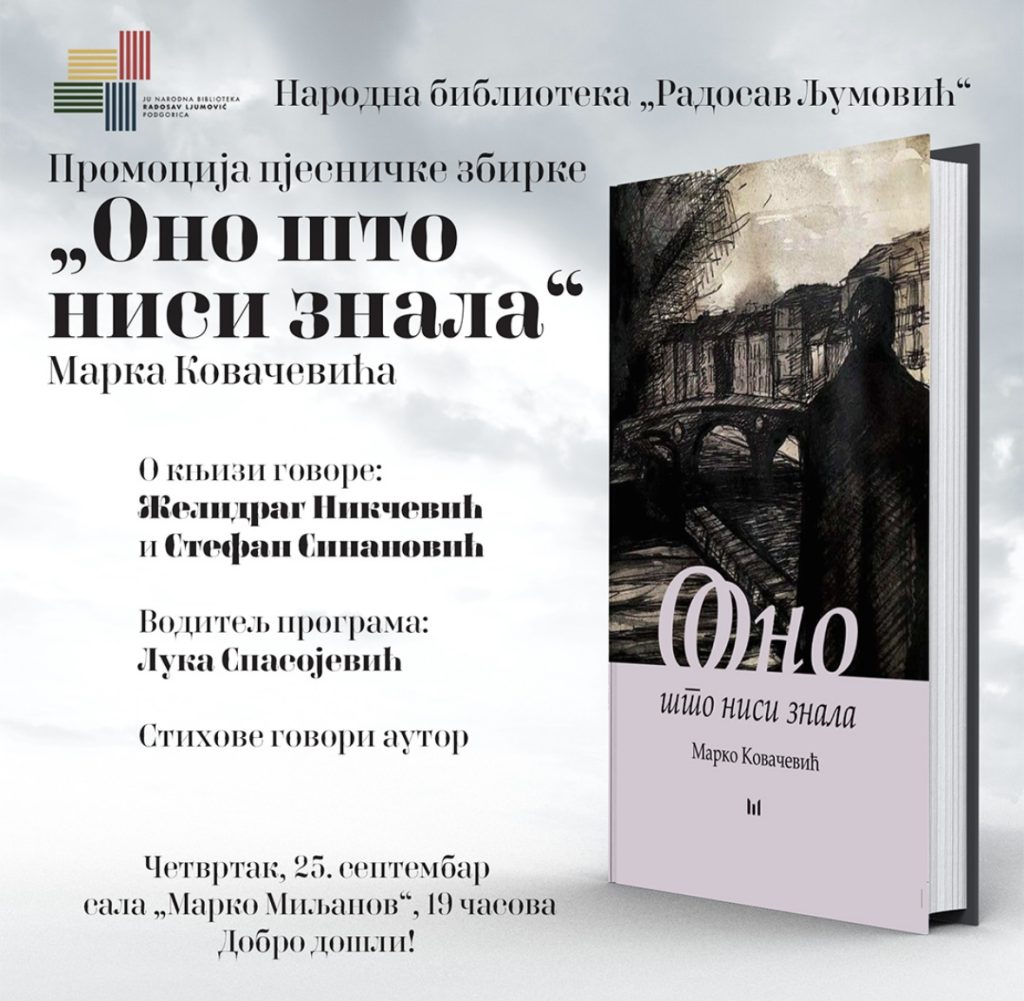 Narodna biblioteka “Radosav Ljumović”, u četvrtak, 25.septembra, u 19 časova, organizuje promociju knjige poezije “Ono što nisi znala” Marka Kovačevića.