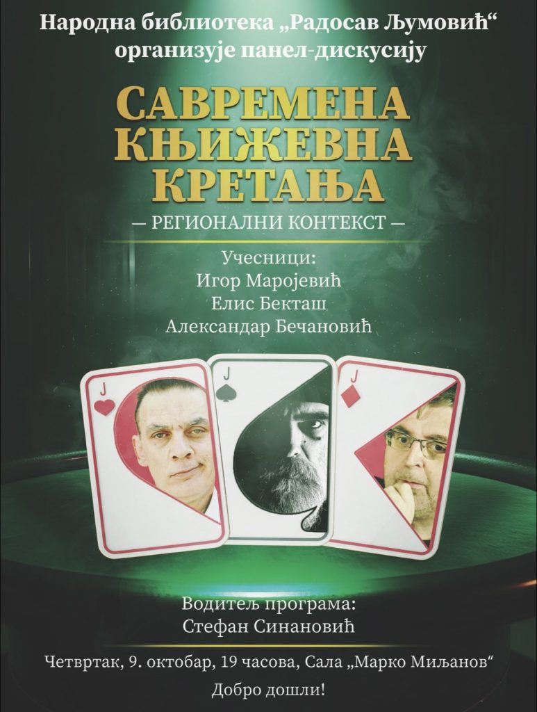 Narodna biblioteka “Radosav Ljumović”, u četvrtak 9. oktobra, s početkom u 19 časova, organizuje panel-diskusiju pod nazivom “Savremena književna kretanja – regionalni kontekst”.