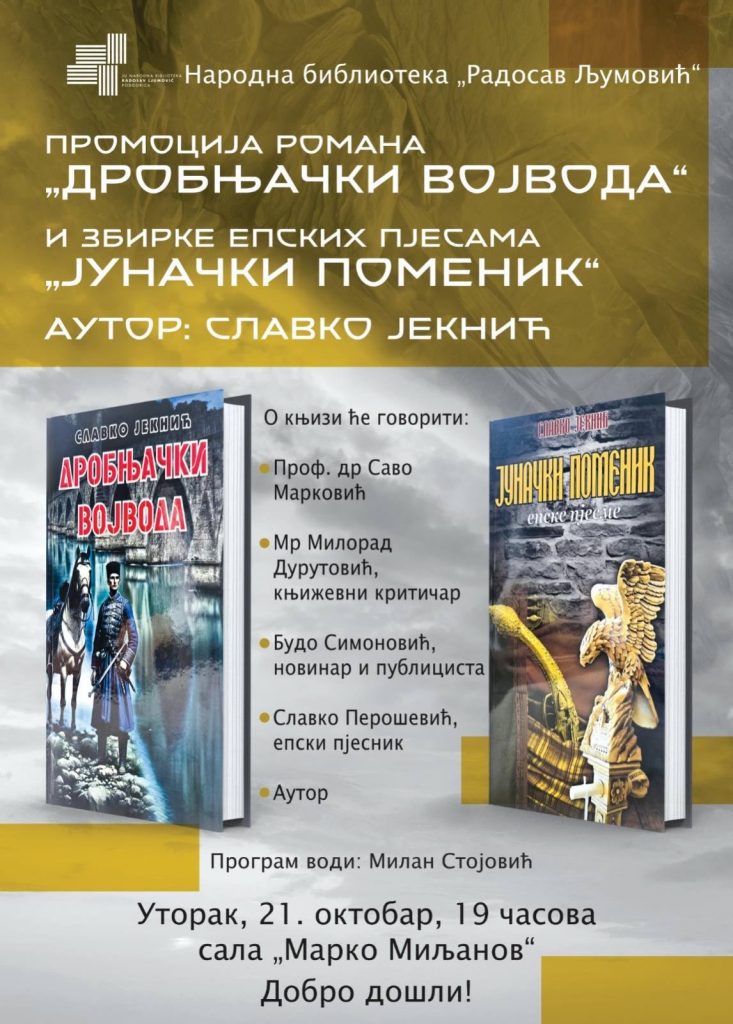 Promocija romana “Drobnjački vojvoda” i zbirke epskih pjesama “Junački pomenik”, autora Slavka Jeknića, biće održana u Biblioteci “Radosav Ljumović” u utorak, 21. oktobra, u 19 časova.