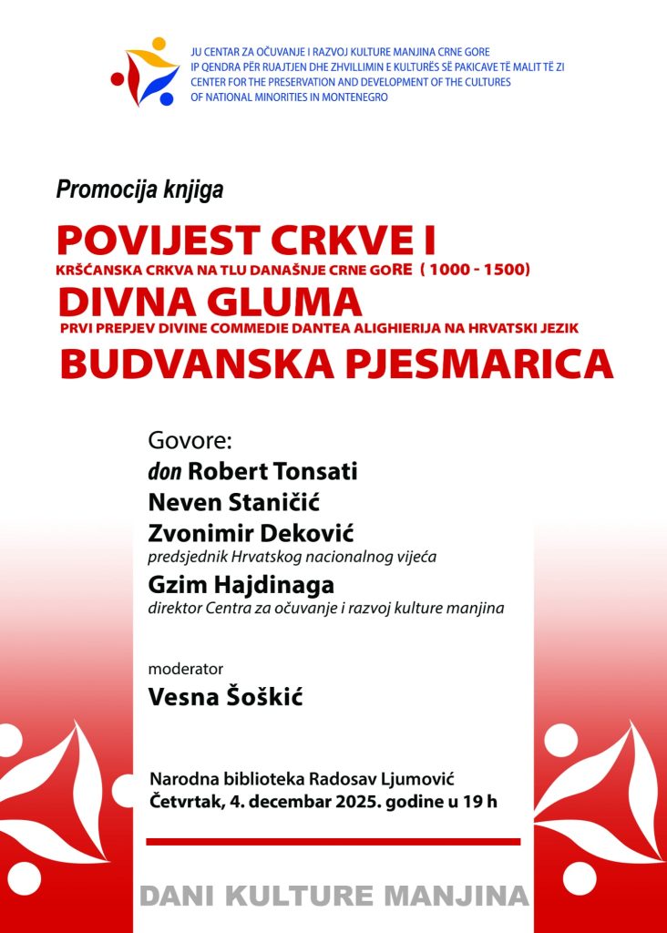 U organizaciji Centra za očuvanje i razvoj kulture manjina (Cekum) u Biblioteci “Radosav Ljumović” u četvrtak 4. decembra, biće organizovana promocija knjiga “Povijest crkve I” – kršćanska crkva na tlu današnje Crne Gore (1 000 – 1 500)”, “Divna Gluma” – prvi prepjev Divine commedie Dantea Alighierija na hrvatski jezik, kao i knjige “Budvanska pjesmarica”.