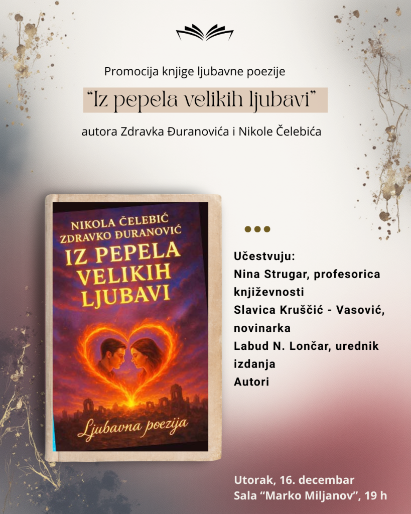 U NB„Radosav Ljumović“, u utorak 16. decembra, s početkom u 19 časova, biće održana promocija ljubavne poezije „Iz pepela velikih ljubavi“, autora Zdravka Đuranovića i Nikole Čelebića.